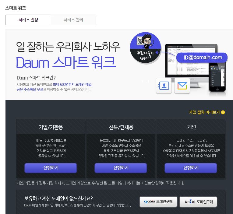 신청 페이지 주소: http://mail2.daum.net/hanmailex/Top.daum?COMMAND=domainRequest