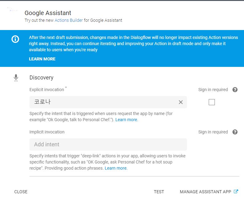 Develop로 이동 후 Display name을 나의앱이라고 입력 후 저장합니다. (코로나와 같은 구글홈에 이미 등록된 명령으로 하면 오류가 날 수 있으므로 나의앱과 같은 흔하지 않은 이름으로 설정하시는 것을 추천합니다.)