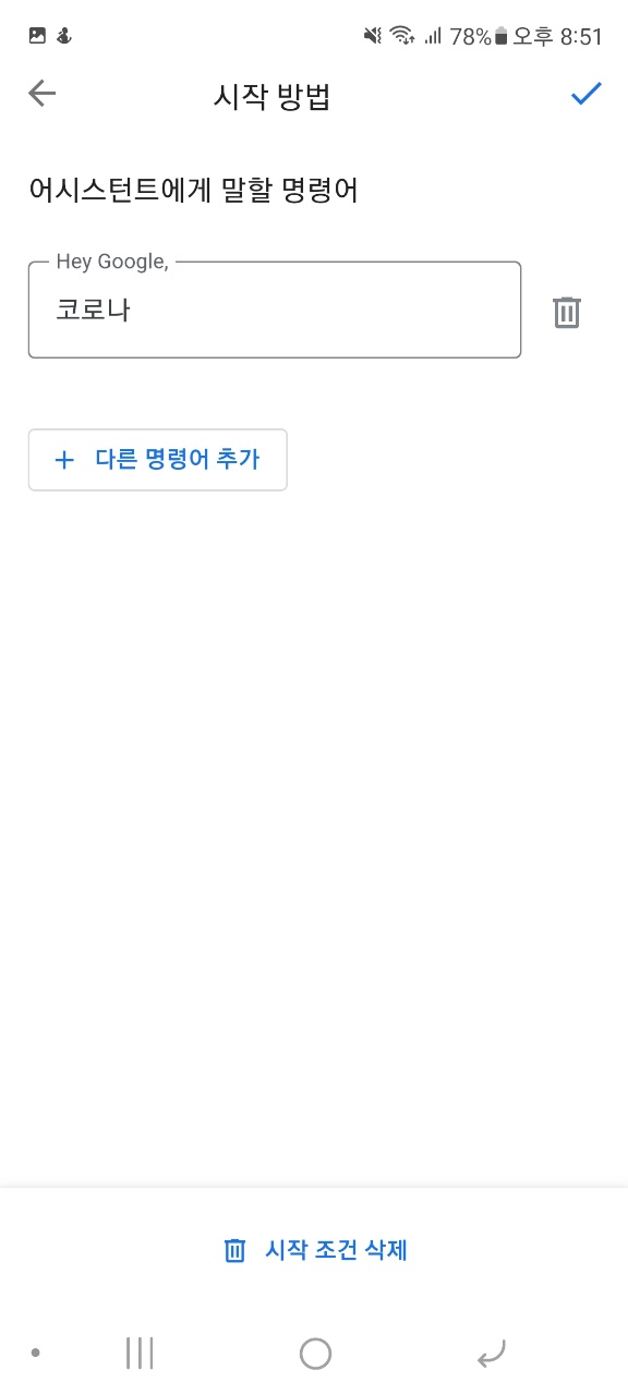 시작 조건에서는 음성 명령에다 코로나라고 입력후 체크표시를 클릭합니다.