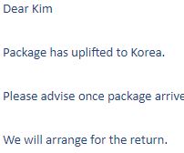 문제는 미국 회사와 싱가포르 회사 사이 간에 환불 내용이 전달이 잘 안된 모양입니다. 취소된 날에 싱가포르 매니저가 상품을 발송하고 송장을 보내줬습니다. 취소했다고 말하니까, 이미 늦었다고 하였습니다. 그리고 한국에 도착하면 연락을 달라고 하였습니다.