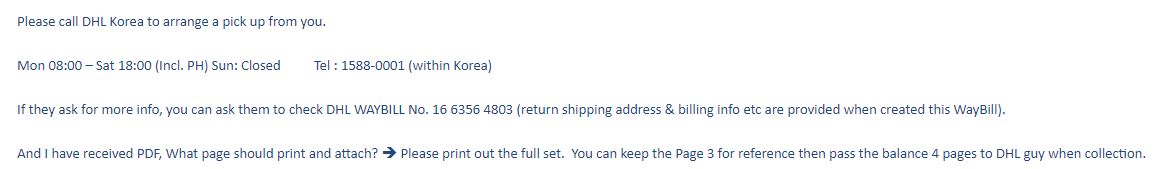 이 송장을 인쇄까지 하고 다 준비가 되었으면 DHL KOREA에 전화해서 픽업 요청을 해야 합니다.