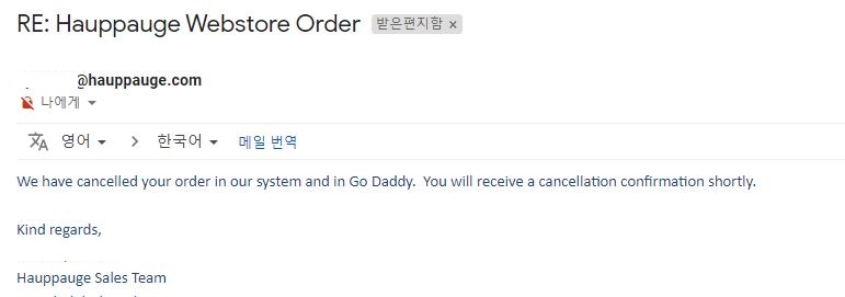 제가 한 달 전에 해외직구 물품 판매자 공식 사이트에서 구매한 Hauppauge Dual 튜너를 구매했습니다. 당시 60달러 정도 하는 가격이었습니다. 2 채널까지 동시 시청이 가능하다 해서 사고 싶은 욕구 때문에 구매했는데, 배송되기 전의 주말에 마음이 바뀌었습니다. 주문 취소를 위해서 주문번호를 메일로 전달하여서 취소 문의를 넣었습니다.