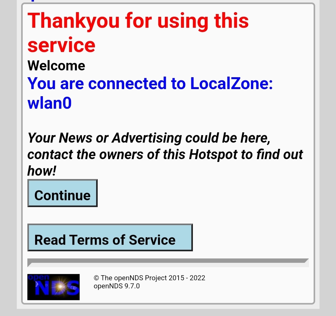 opkg install opennds 이 명령어를 입력하면 자동으로 설치가 되며, 설치 후에는 자동으로 서비스 활성화가 되어서 공유기에 접속해있는 기기는 외부와 어떠한 인터넷 연결도 되지 않습니다. (opennds는 nodogsplash 기반으로 제작된 captive portal 서비스입니다. nodogsplash 보다 더 많은 기능을 지원하며, 꾸준한 업데이트가 이루어지고 있습니다.)