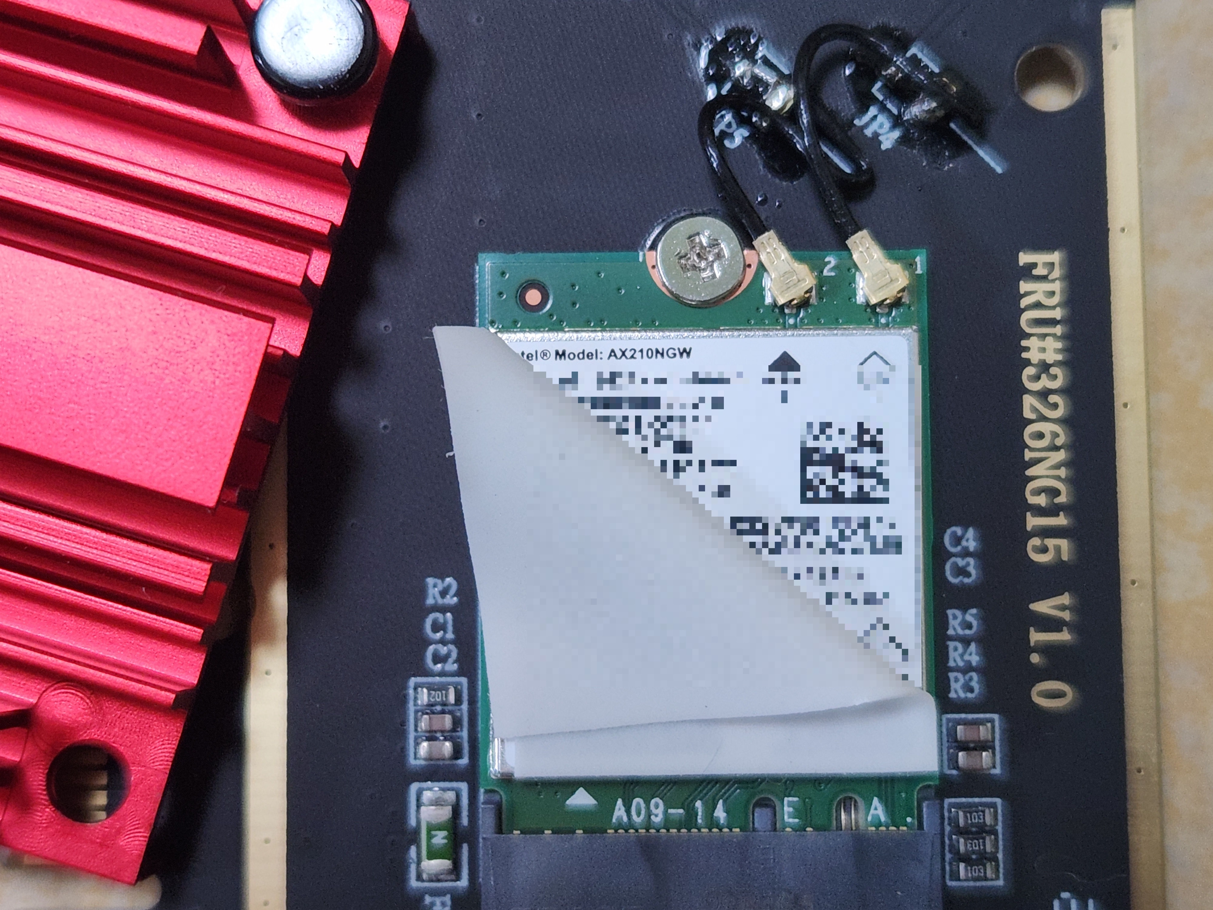 저 PCI-E 타입 무선랜카드의 빨간 판을 떼어내면 요렇게 AX210NGW 무선랜카드가 보이네요.
