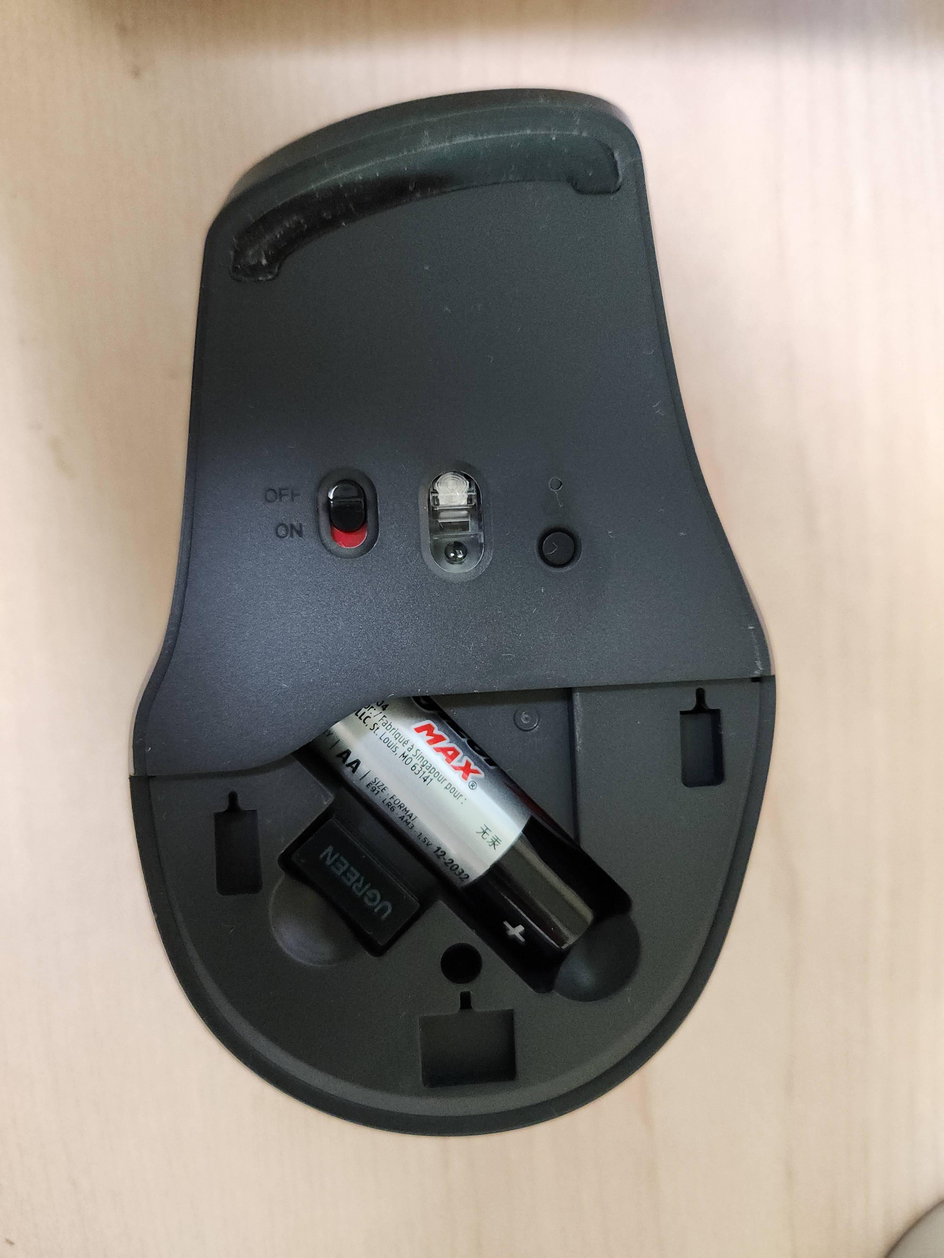 밑면은 DPI 전환 버튼과 케이스를 열면 건전지를 넣을 수 있게 되어있습니다. AA 1개 들어갑니다. 건전지 미포함이라서 집에 있는 건전지 넣었습니다.