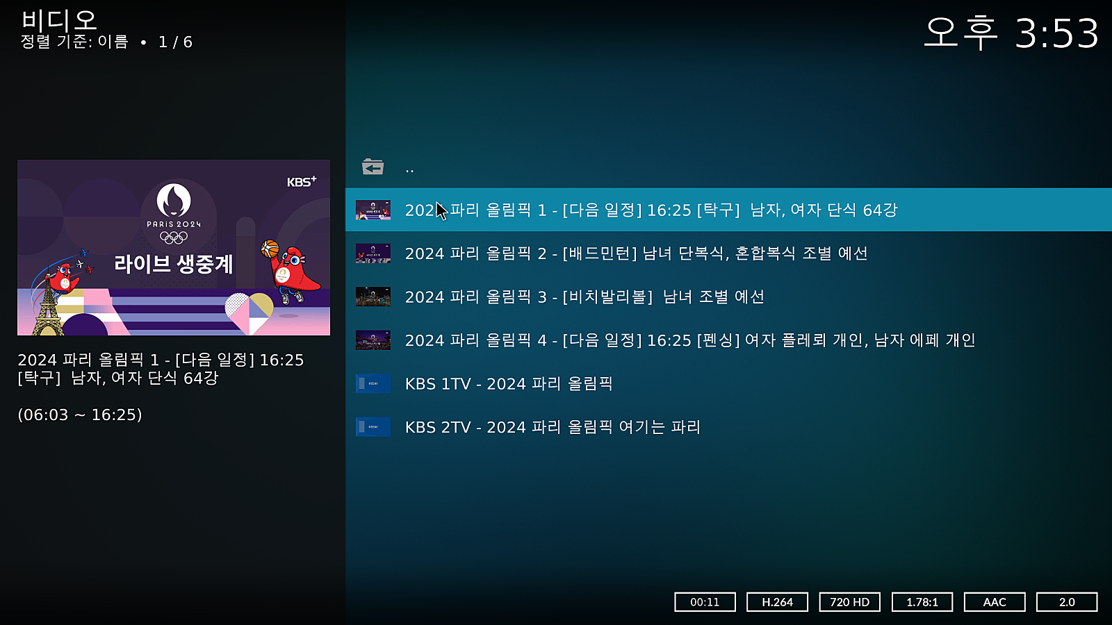 이후 열기를 클릭하거나 메인화면에서 애드온 - 비디오 애드온에 설치한 올림픽 애드온이 있습니다.