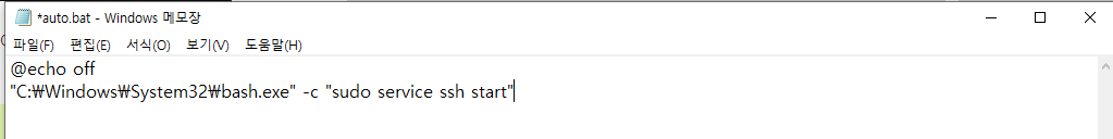 이렇게 메모장에 치셔서 wsl.bat라는 이름으로 시작 프로그램에 저장합니다. 파일명은 확장자가 bat이기만 하면 됩니다.