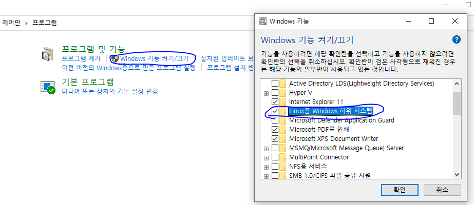 1. 제어판 설정에서 기능 활성화 및 우분투 다운로드