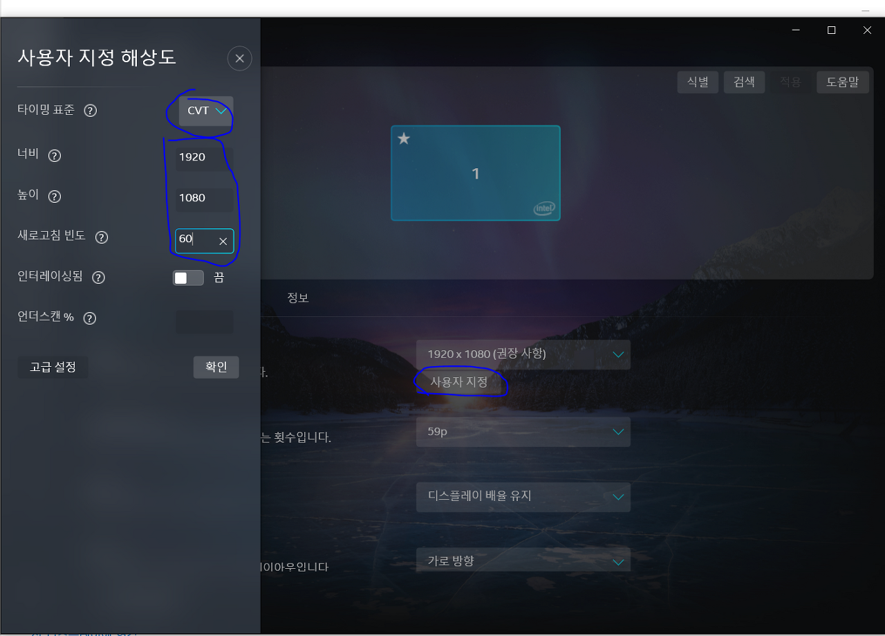 인텔 그래픽 제어판에서 설정을 바꿔야 1920x1080으로 제대로 사용 가능합니다