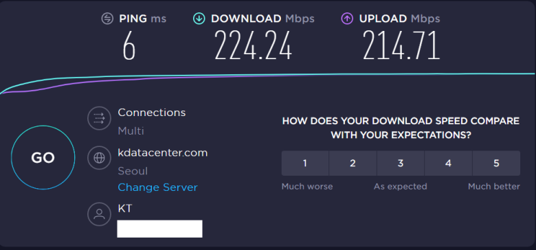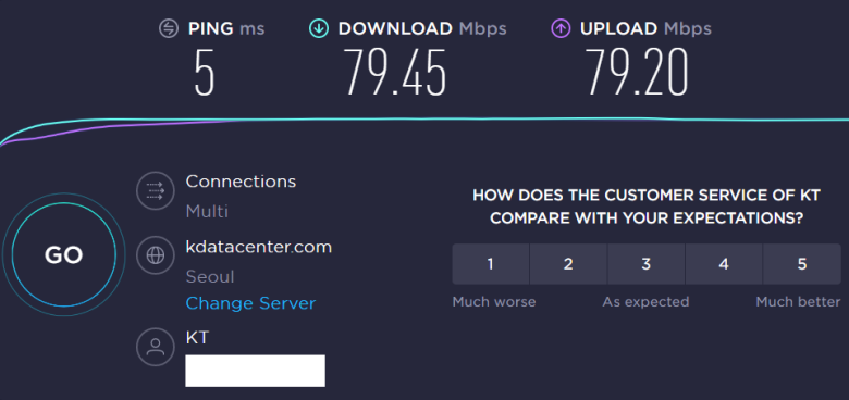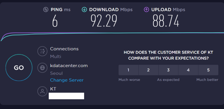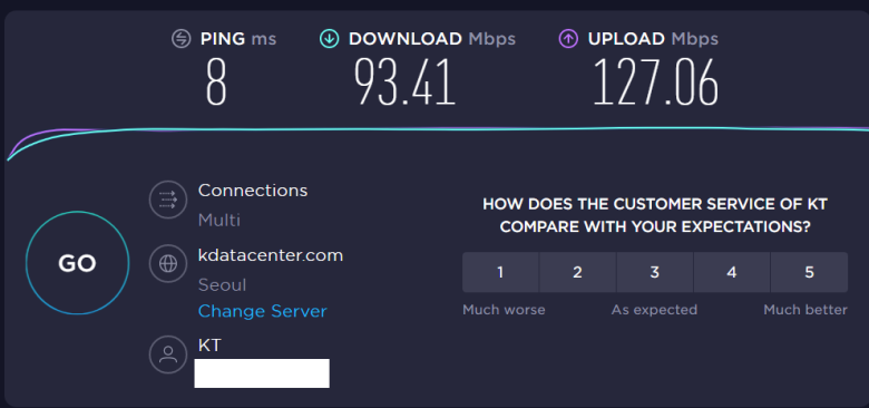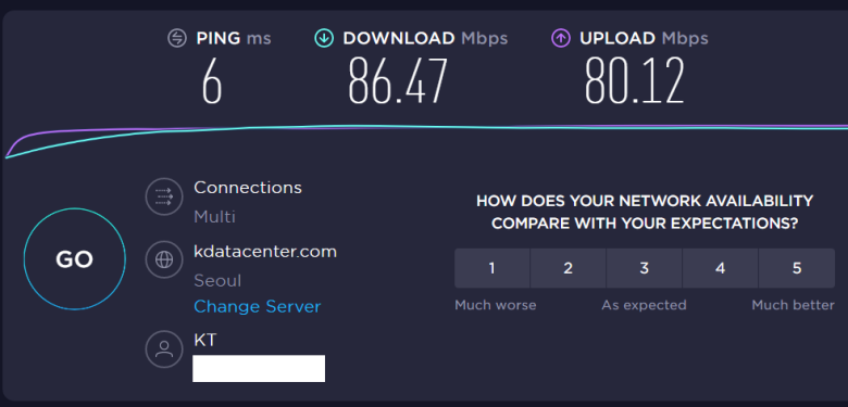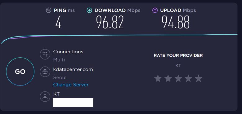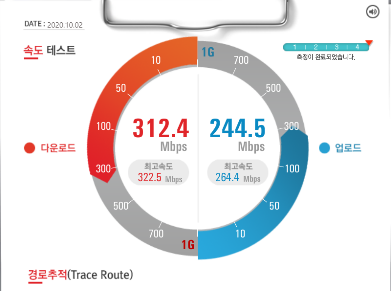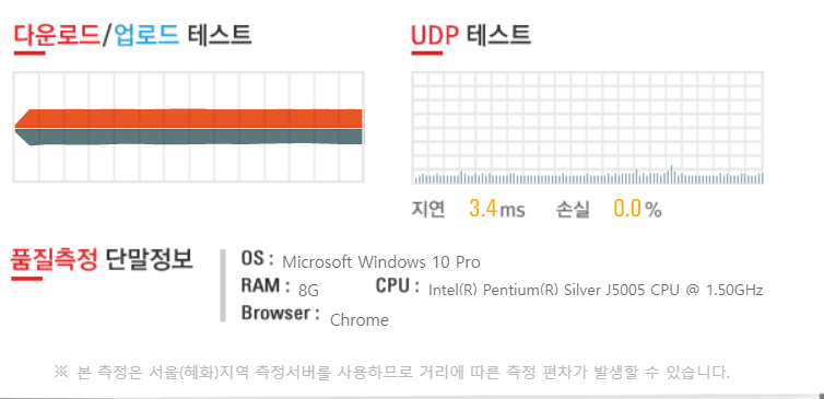 A2004r 유선으로 Nuc와 연결해서 사용할 때를 KT 인터넷 품질 테스트 사이트에서 다시 한번 속도 체크해봤습니다. 진짜 유선급 속도를 보여줍니다.