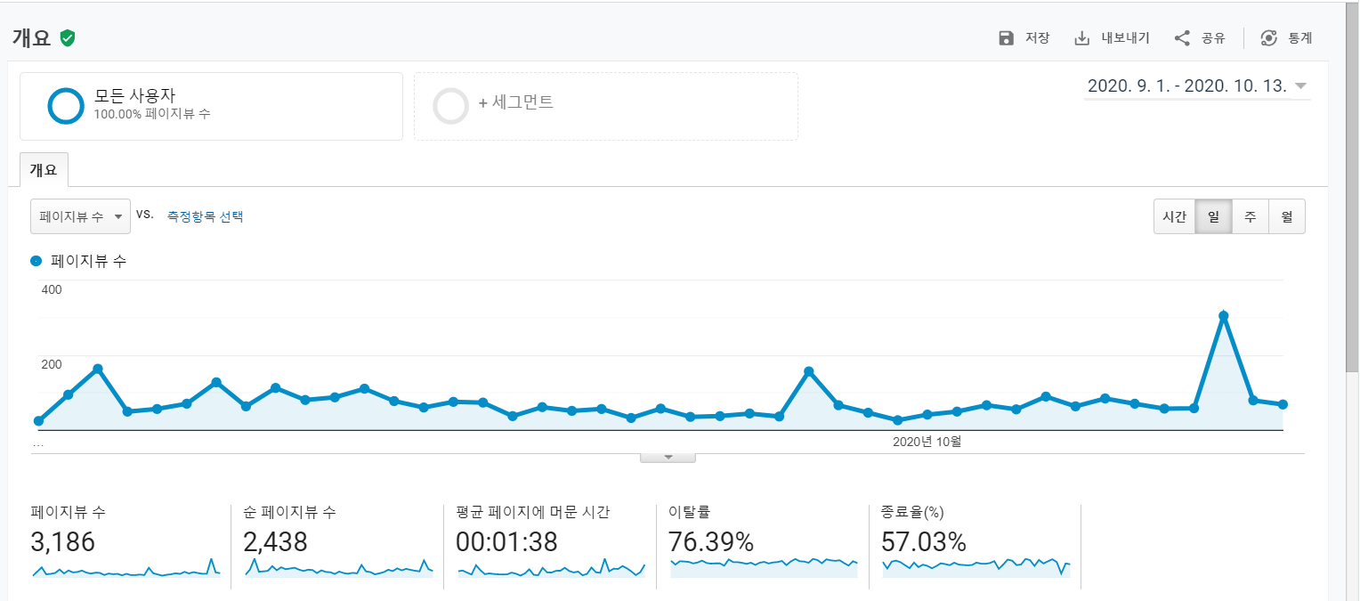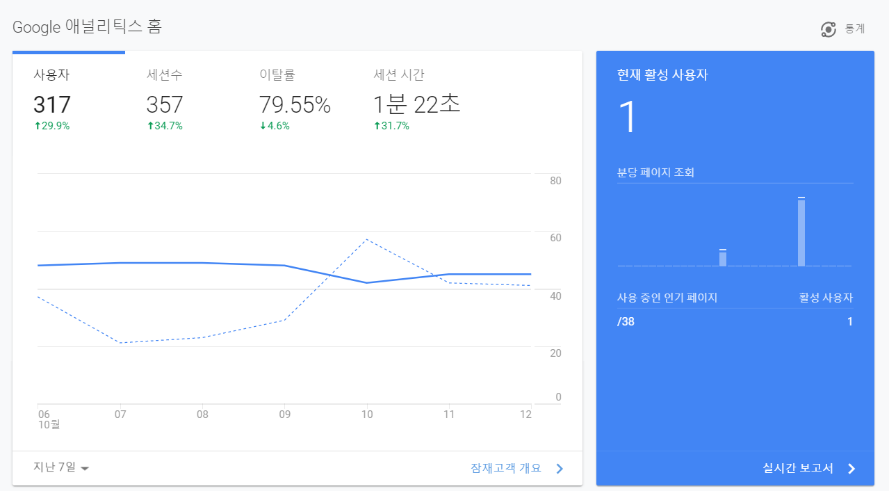 구글 애널리틱스에서 세션 시간과 이탈률은 아직 많이 높습니다. 그만큼 제 블로그에 머무는 시간이 적다는 것이지요.
