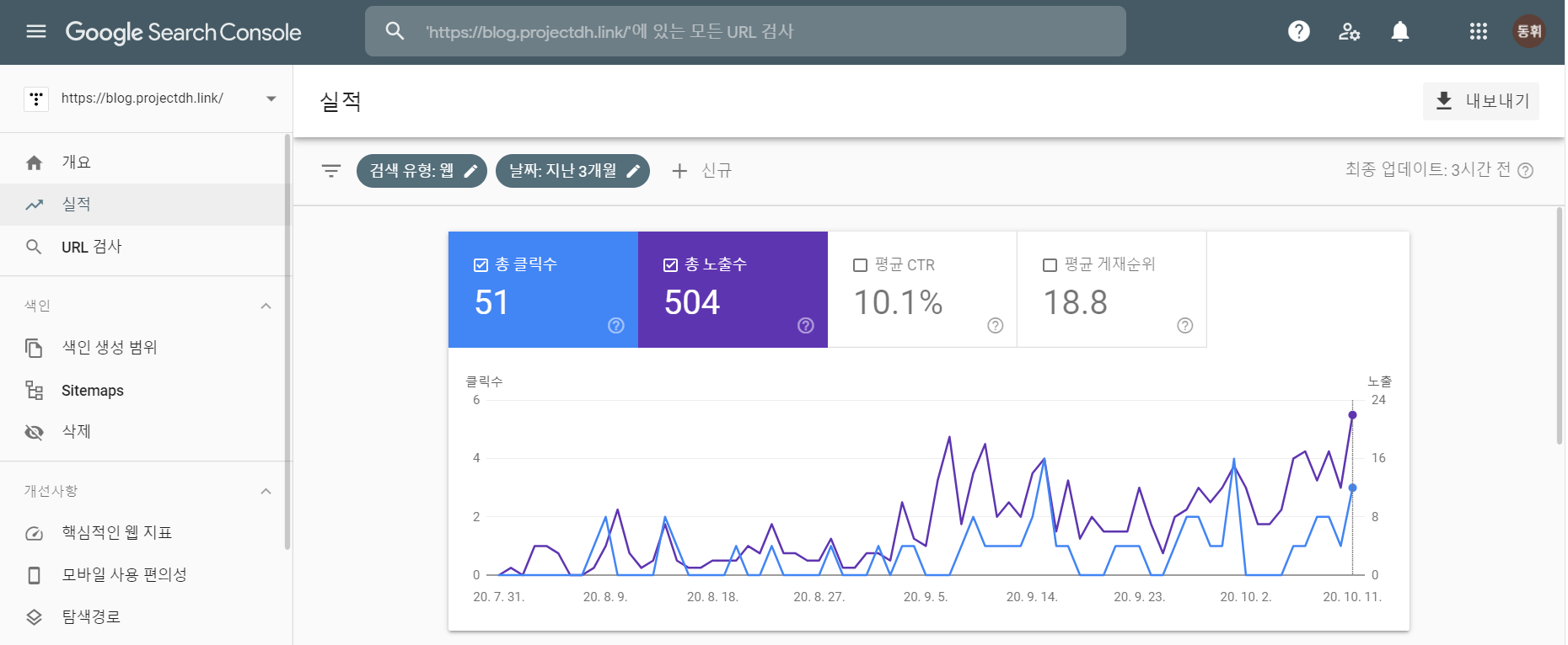 그리고 지난 3개월동안 구글에서 제 블로그가 노출이 된 횟수, 그리고 클릭은 횟수입니다. 아직 많이 대단하지는 않지만, 충분한 가치는 있어 보입니다.
