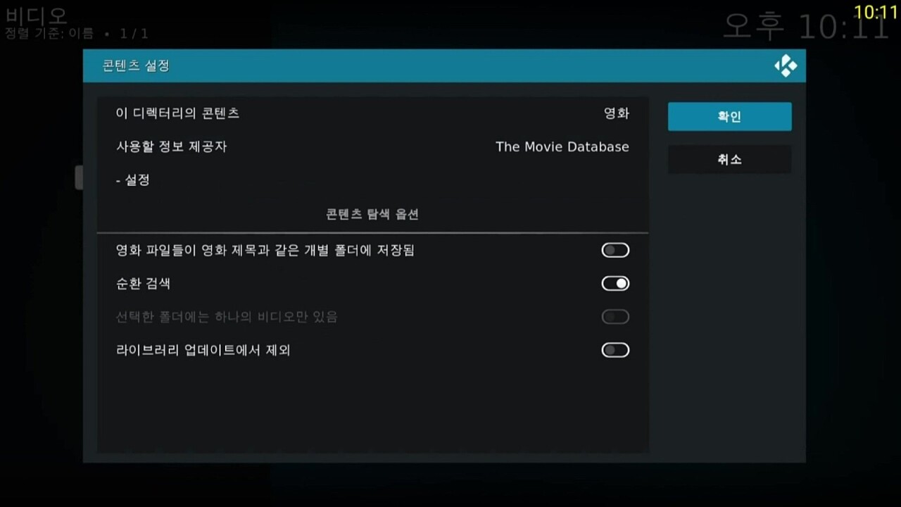 확인을 누르면 비디오 콘텐츠를 선택할 수 있습니다. 저는 영화로 선택하였고, TMDB를 눌렀습니다. 국내 영화 정리에는 Daum 영화 에이전트가 훨씬 좋기는 합니다.