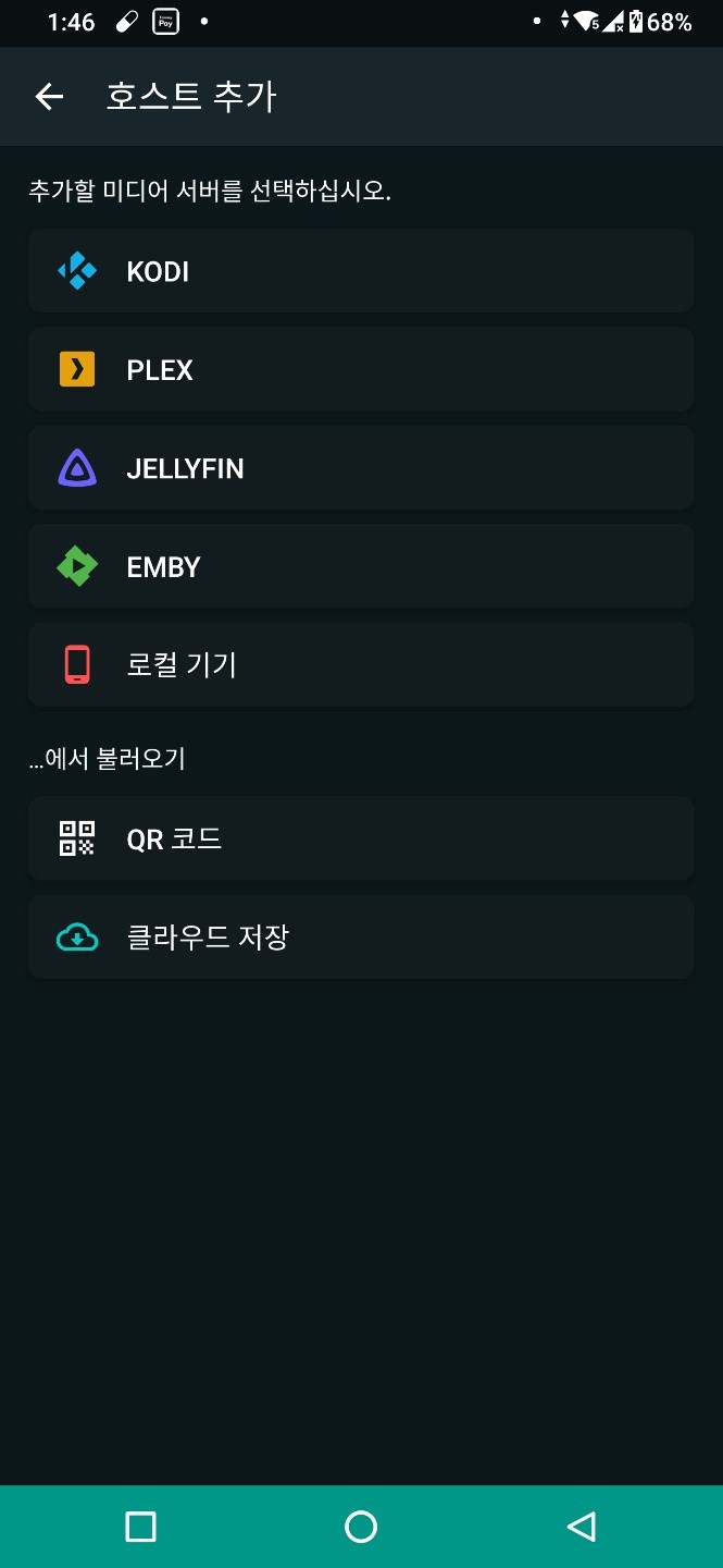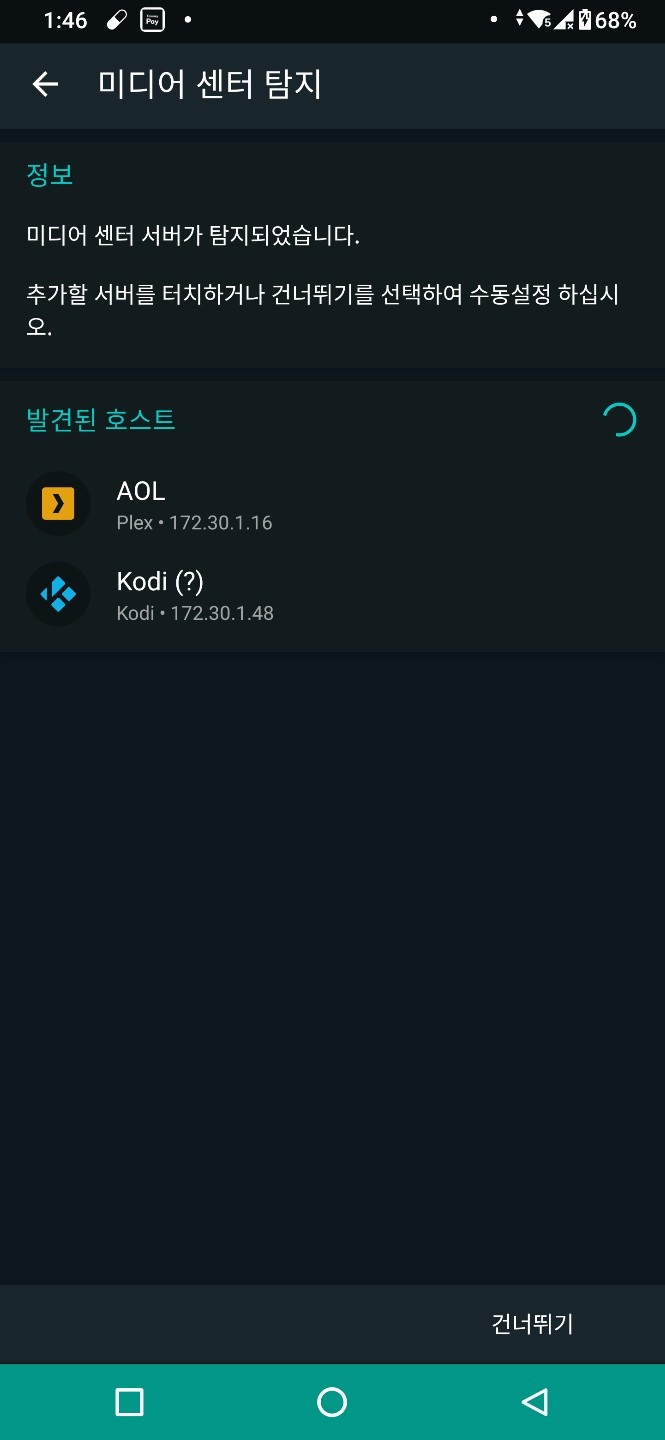만약에 감지되지 않았으면 건너뛰기를 눌러서 호스트 추가로 넘어가고 KODI를 누릅니다.