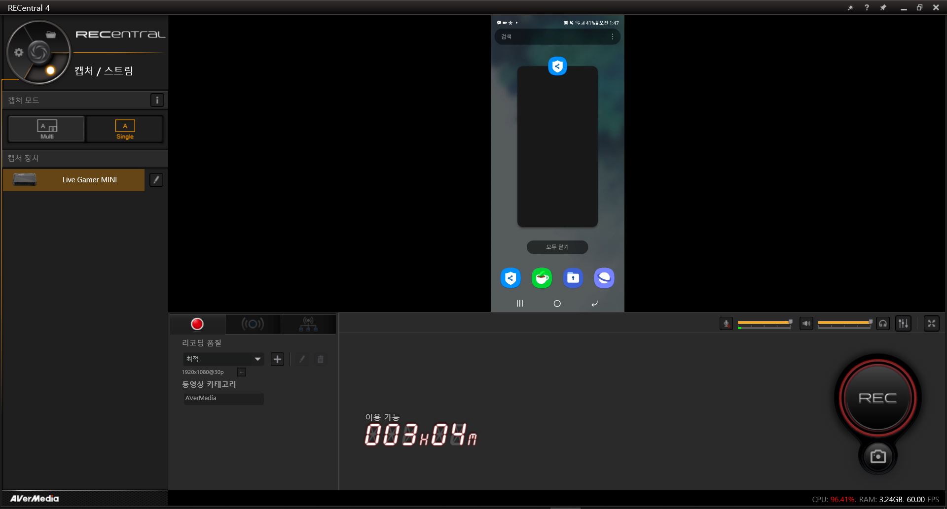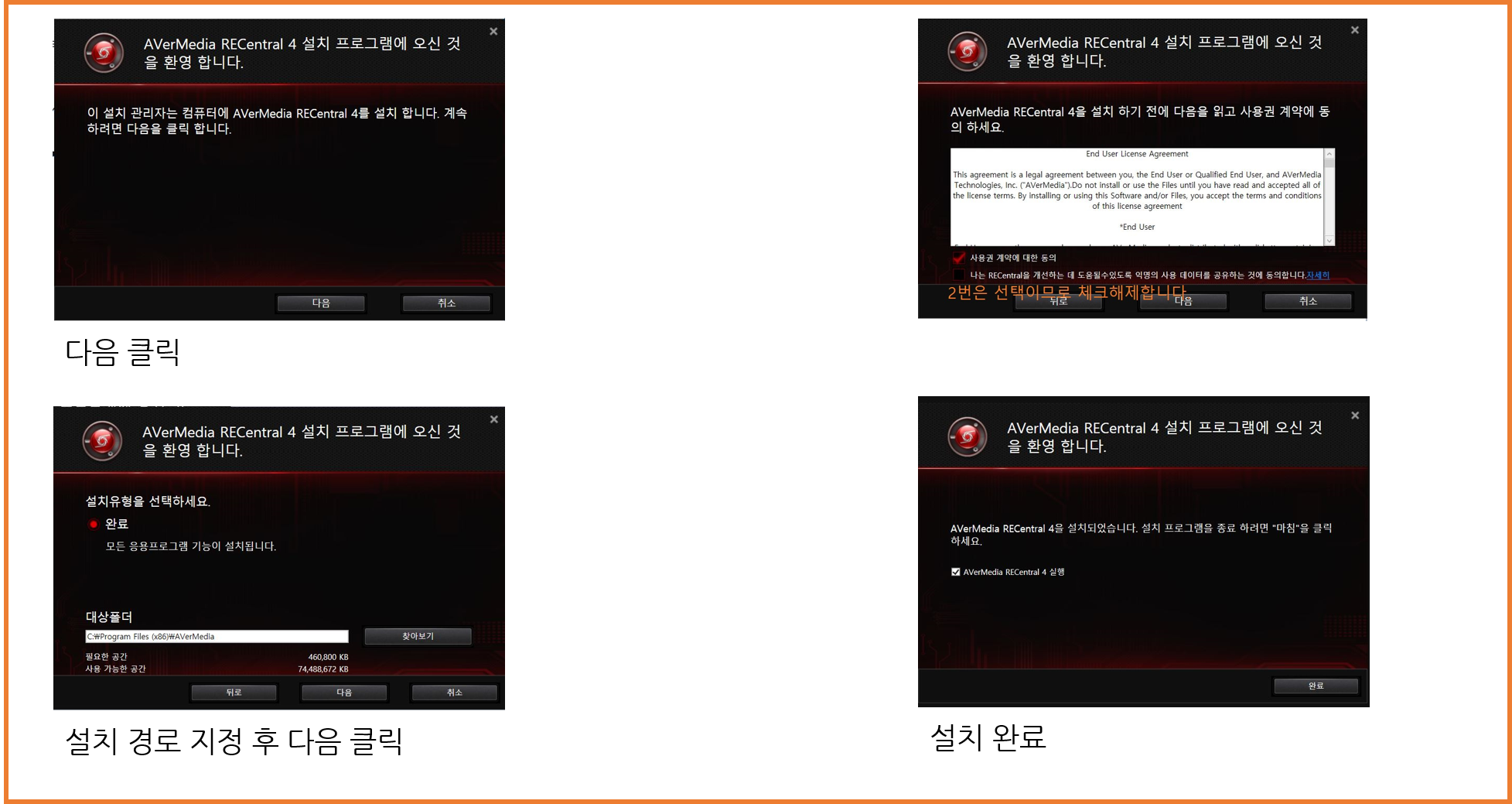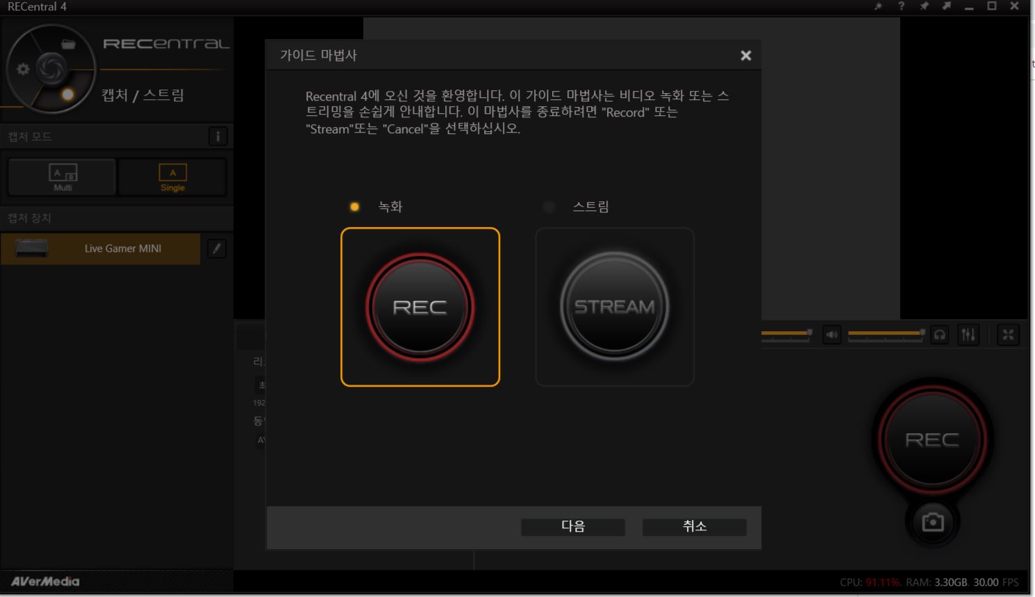 연결하고 나서 바로 사용이 가능합니다. 하지만 에버미디어의 기본 제공 프로그램인 Recentral 4 프로그램을 설치하면 캡쳐보드의 설정, 펌웨어 업데이트를 할 수 있습니다.