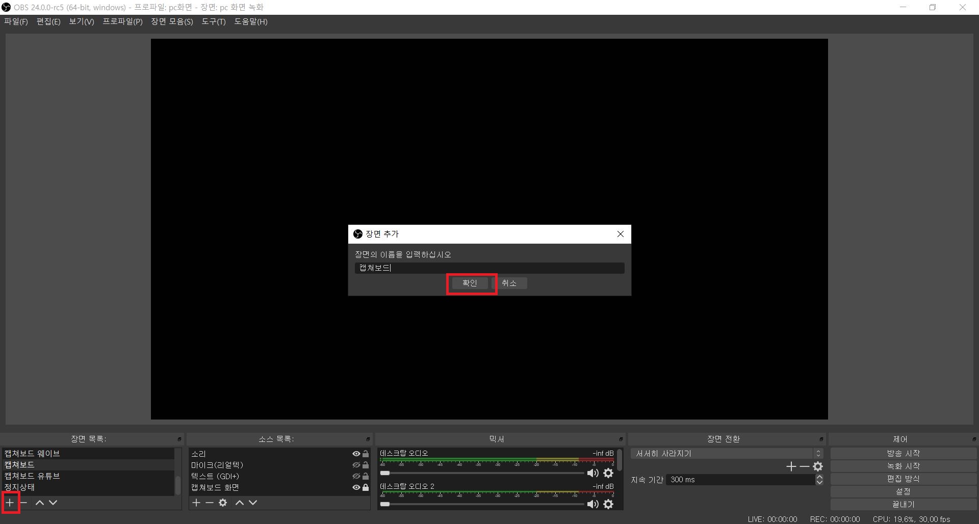 우선 장면 목록에서 +버튼을 누르고 장면 이름을 설정 후 확인을 누릅니다.