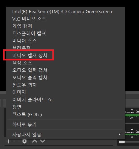 그 다음은 소스 목록에서 +버튼을 눌러서 비디오 캡쳐 장치를 눌러줍니다. 이게 바로 캡쳐보드의 영상 실시간 소스를 추가하는 과정입니다.