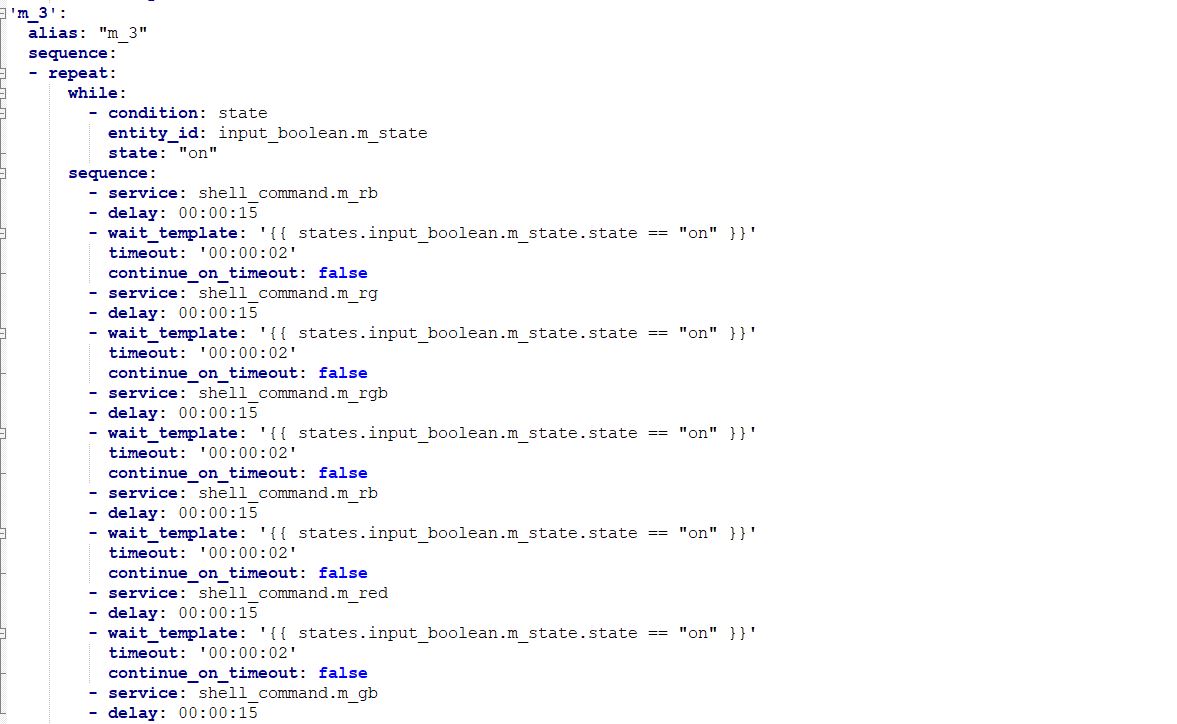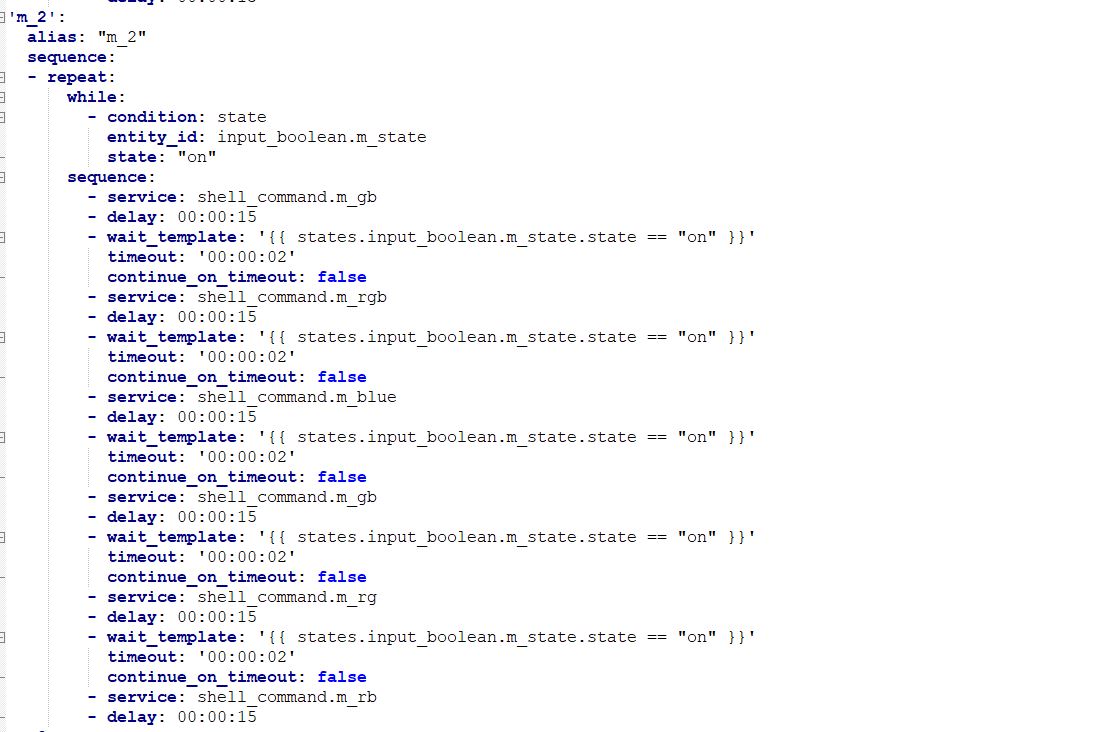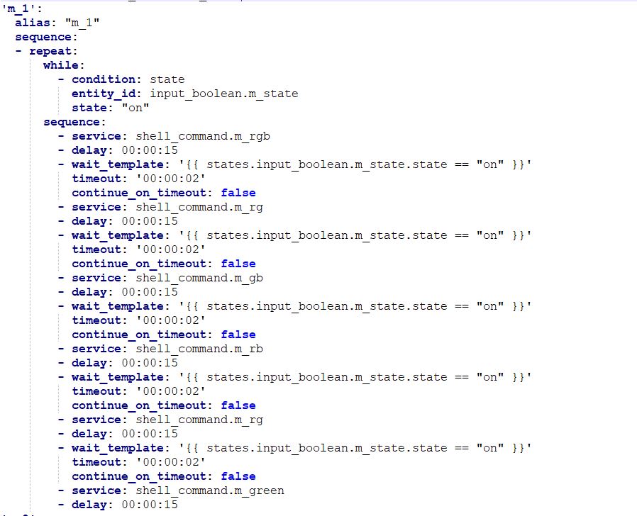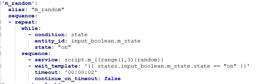 딜레이도 변경할 수 있고, 이 역시 input_boolean.m_state가 켜진 동안만 돌아가고, 만약 꺼지면 wait_template에서 걸립니다. 2초동안 대기하고 on이 아니면 스크립트 종료입니다.