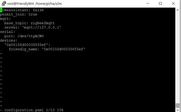 vi 에디터 기본 편집 방법을 사용해서 permit_join 옵션을 true(기본적으로 true), homeassistant 옵션을 true(기본적으로 false)로 변경합니다.