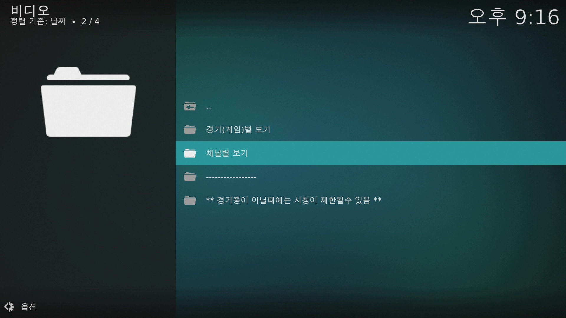 채널별 보기는 5개 채널입니다. 공휴일에는 지상파에서 야구 중계를 하기도 합니다만, 그때도 이렇게 채널명은 같게 뜨지만 실제로는 야구 중계 중인 채널로 연결됩니다.