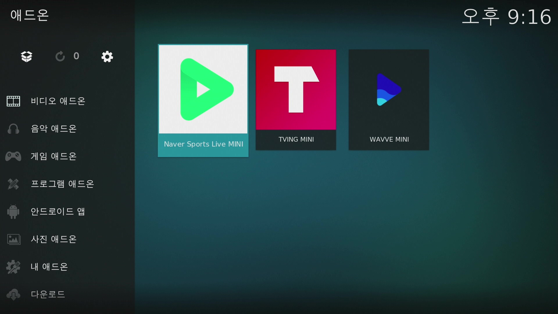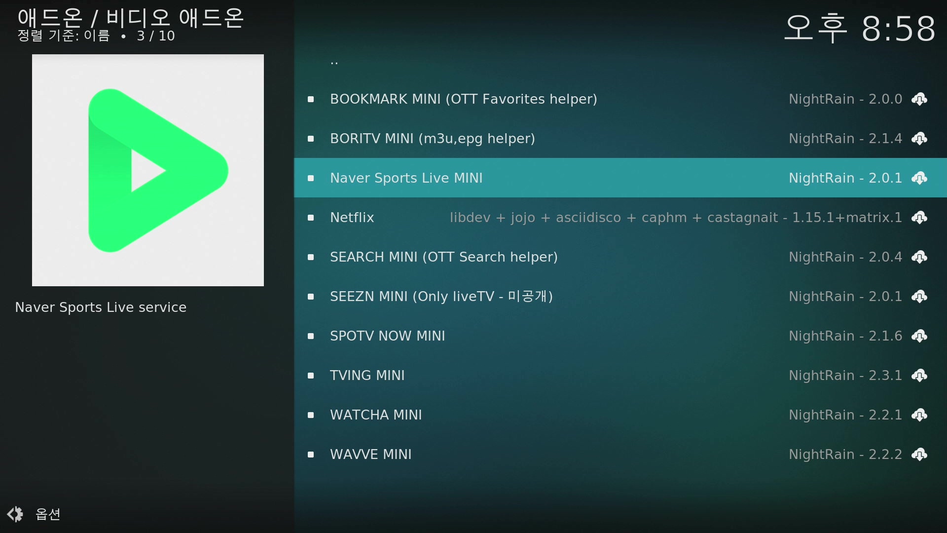 설치 후 뒤로 나와서 저장소에서 설치 => korea ott for kodi 19 => 비디오 애드온 에서 Naver Sports Live Mini를 설치합니다.
