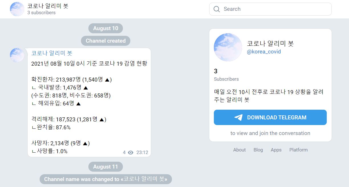 매일 0시 기준 감염 현황을 알려주는 코로나 알리미 채널을 만들었습니다.