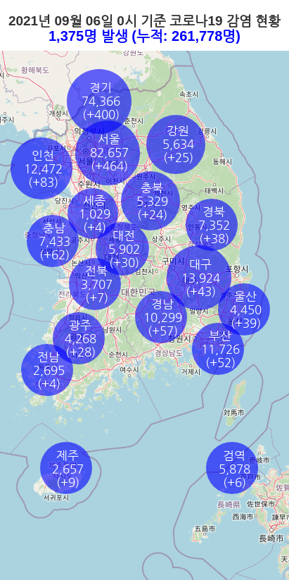 지도에 지역별 확진자수 띄우기 자동화 성공하였습니다.