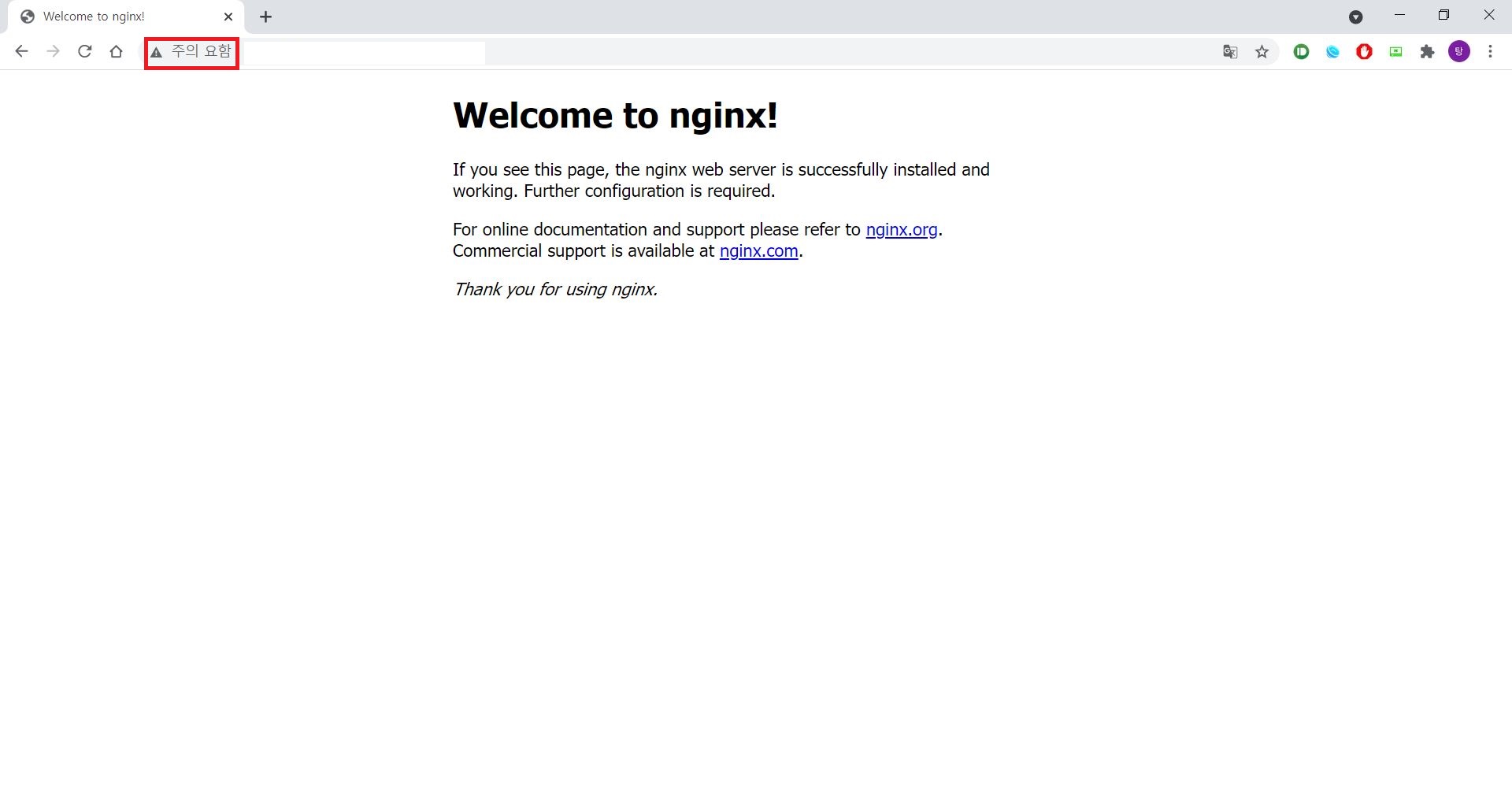 여기까지 하면 웹서버 설치는 바로 끝났습니다만, 주소 옆에 주의 요함이라고 표시가 되어 있을 겁니다.